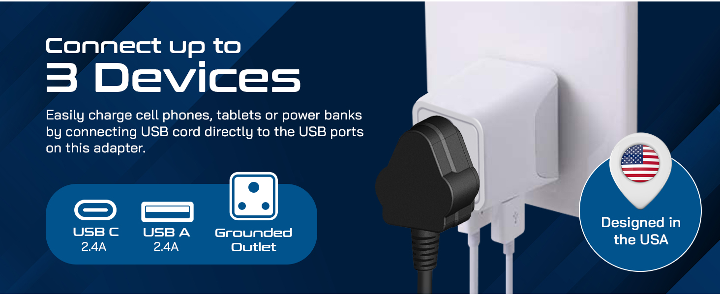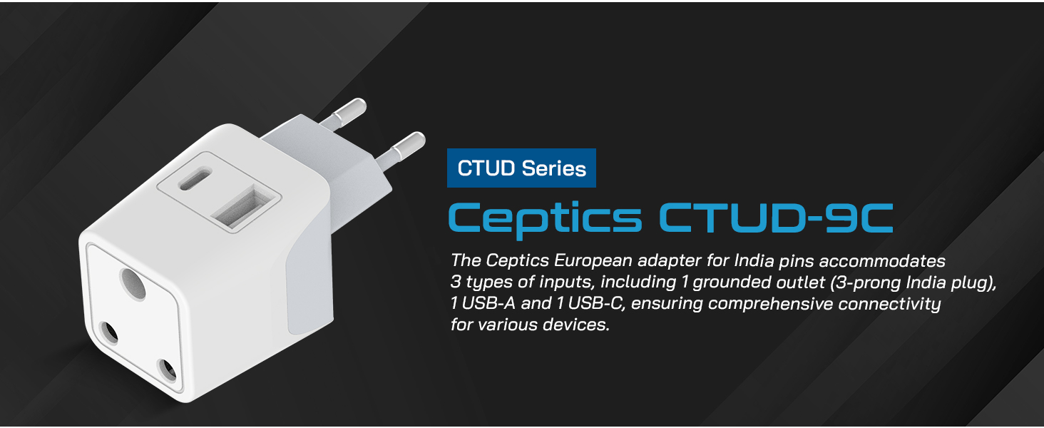 3-IN-1 INPUTS: The Ceptics europe travel adapter accommodates three types of inputs, including 1 grounded outlet (3-prong India plug), 1 USB-A and 1 USB-C, ensuring comprehensive connectivity for various devices.