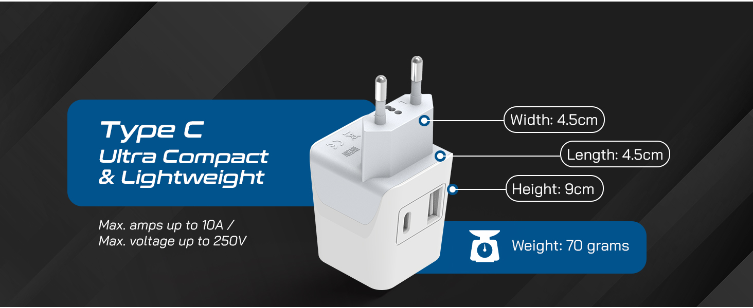 ULTRA-COMPACT: Featuring an ultra-compact size of 1.5 x 1.5 x 3.5 inches, the universal travel adapter Europe prioritizes safety with a maximum load rating of 10A/240V, providing a compact yet powerful solution for your electrical needs.