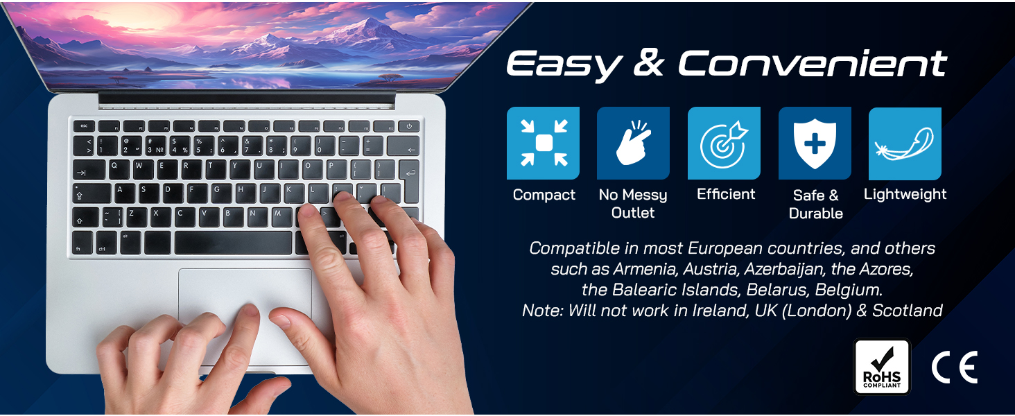 OUTPUT Type C: The travel adapter Europe is compatible in overseas countries, including Turkey, Spain, Ukraine, Greece, Finland, Bulgaria, offering a reliable power solution for international travelers.